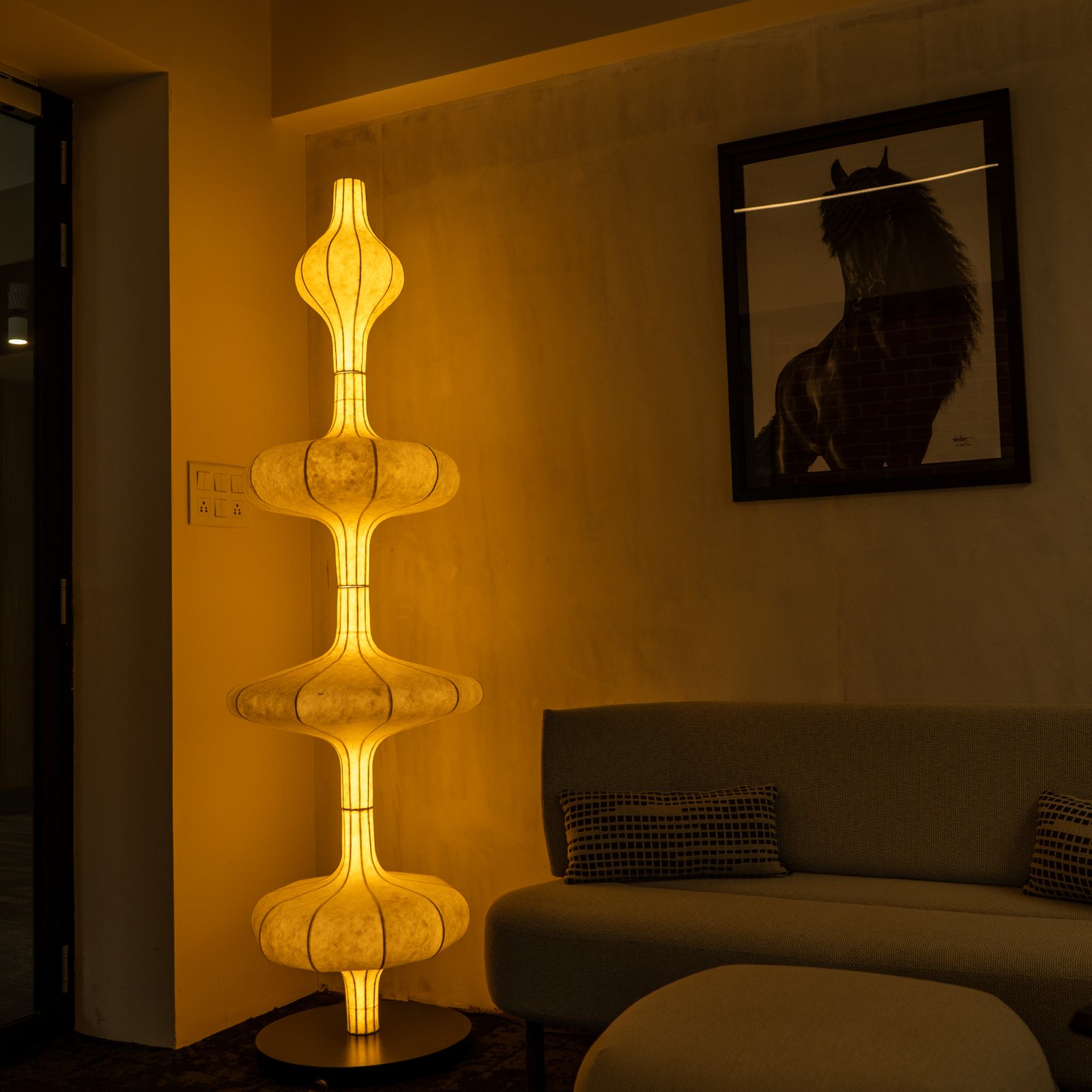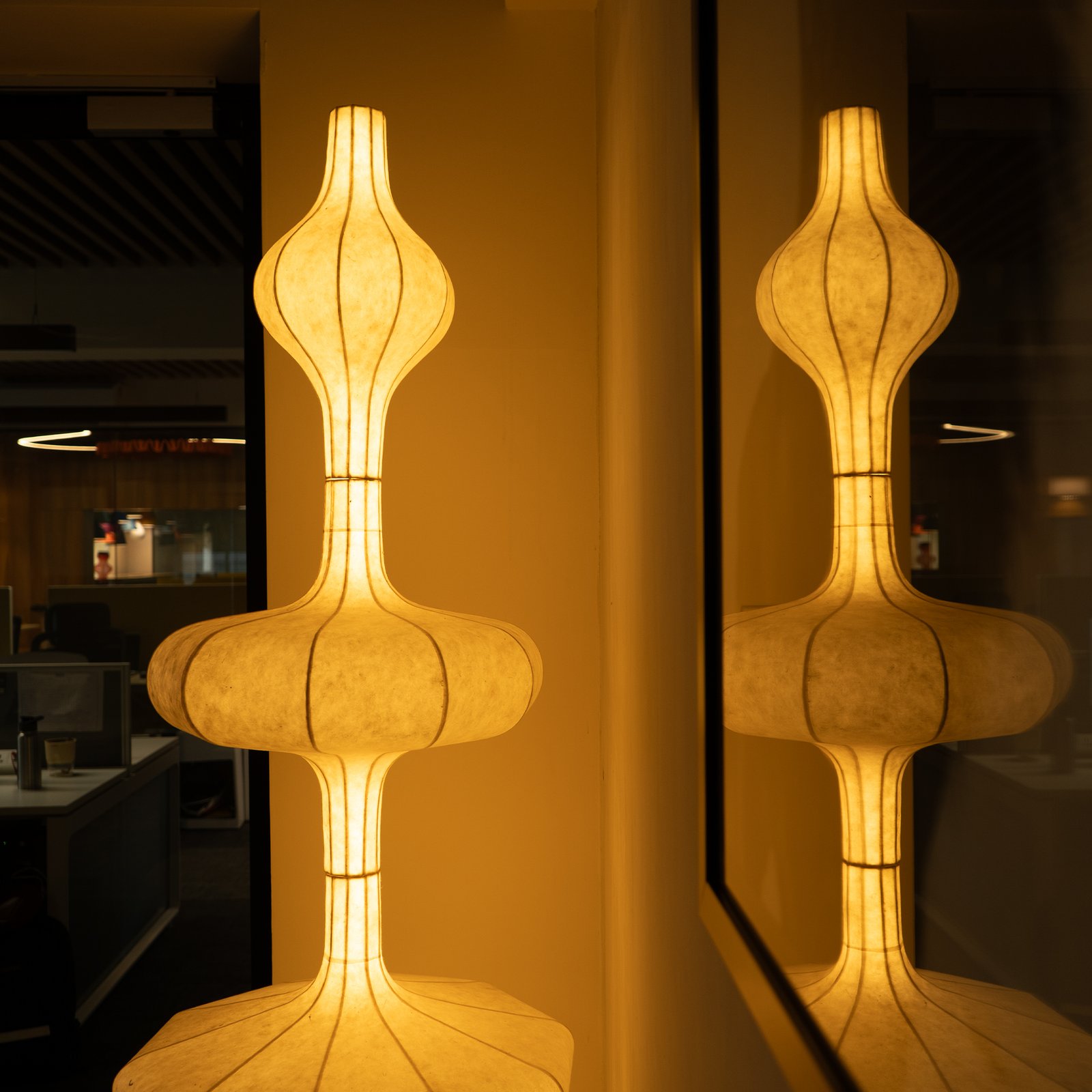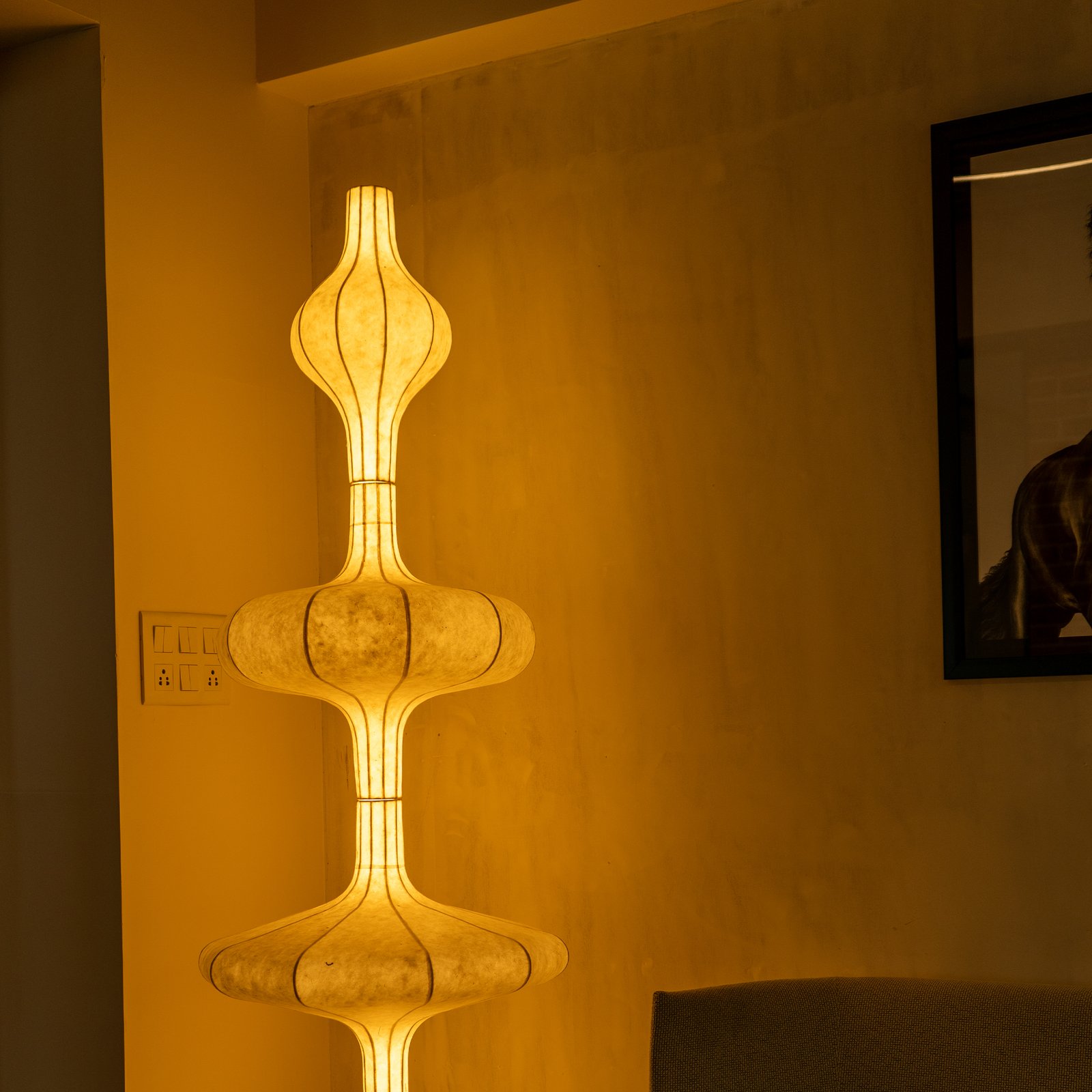 A towering three-tiered floor lamp inspired by Kerala’s temple lamps. Its Lokta paper form radiates a warm golden glow, creating a sculptural focal point for lobbies, lounges, and large living spaces.